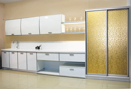Кухня «Глория» (белая) - Новое решение для российского рынка! Эффектные фасады из искусственной кожи: флорентийское золото, античное серебро, стилизация под кожу диких животных. В