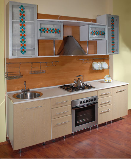 Фасады: МДФ Столешница: постформинг Скиф Мойка: нержавеющая сталь Стекло с рисунком в алюминиевом профиле.