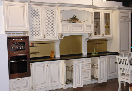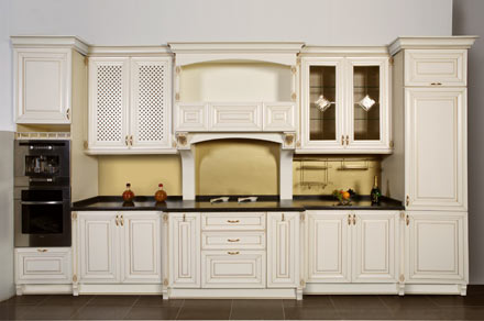 Шедевры великого Леонардо вдохновили современных итальянских мастеров на создание этого гарнитура: роскошный портал, резные колонны и пилястры, матовая позолота на фасадах нежного молочного цвета. Кухня для ценителей творчества эпохи Возрождения.